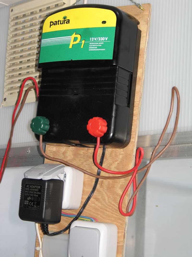 N° 1 : le boitier haute tension installé à l'intérieur, dans le couloir de la volière principal. Celui-ci permet une connexion sur le réseau général mais on peut aussi utiliser une batterie.