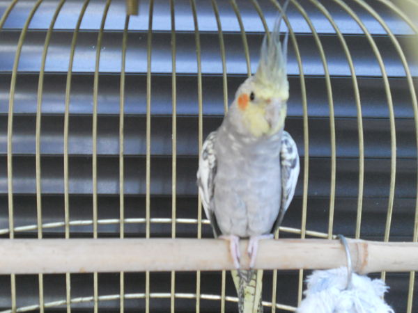 A gauche, en bas, une opaline cinnamon JJ du même âge. En haut à  droite on aperçoit le dos de son frère.