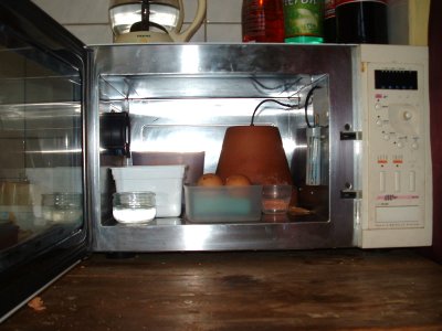 Très original le recyclage d'un four à  micros ondes en couveuse :etonne:
