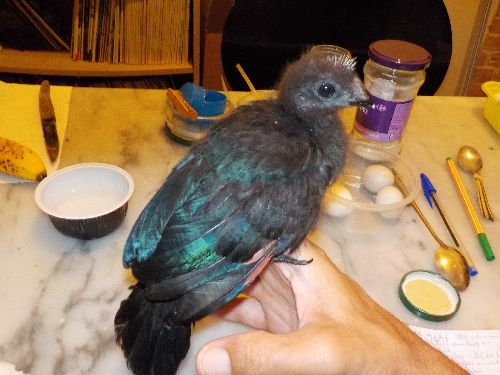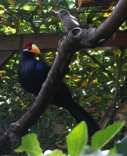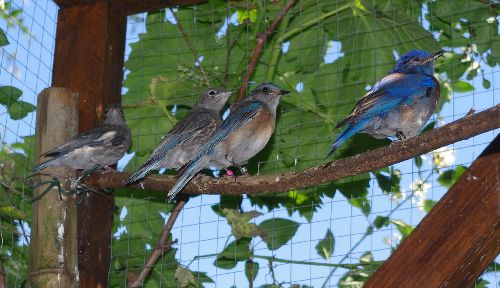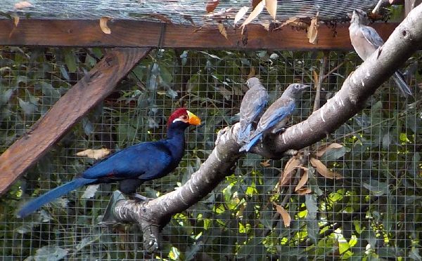 Donc, il semblerait que cela se confirme, certains petits merlebleus sont plus colorés (la deuxième couvée) et devraient être des mâles. L'oiseau rescapé de la première couvée ressemble beaucoup à la femelle, elle (j'imagine) a fait une mue et n'a plus le buste tacheté. En tout cas, toujours joli et très pacifiques avec la Touraco.