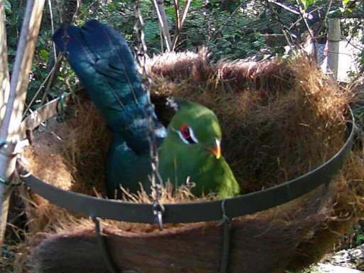 Le printemps se confirme. Première fois où les Touracos semblent ne pas se bagarrer. La femelle et le mâle couvent deux oeufs.