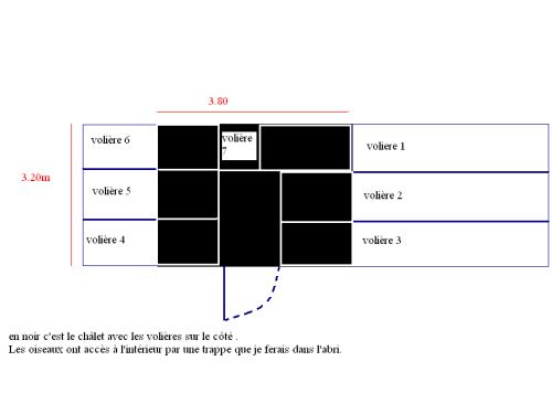 Il y aura 3 volières couloir de chaque côté extérieur du châlet, à  l'intérieur du châlet ca sera les volières intérieures pour les jours de mauvais de temps.