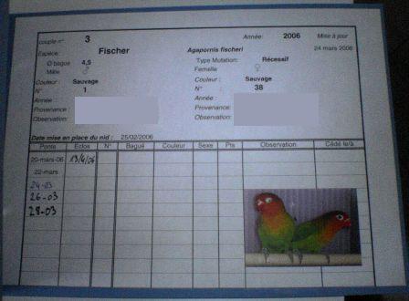 C'est bien fait, je me suis déjà  créé une fiche perso avec open office calc (type excel). Et il y a les mêmes rubriques plus les parents de chaque reproducteur (seulement lorsqu'ils sont de chez moi) . par contre, je ne met rien sur les nids, tout dans la tête. et j'ai aussi mon journal où je relate les évènements: pontes, éclosions, nettoyage, prévisions.