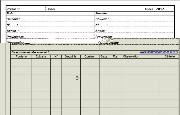 j'utilise ses fiches de ponte depuis 2 ans et j'en suis très satisfaite, je les ai sortie sans difficultés du forum ,faire attention 3 modèles de format, cocher celui qui convient ,après ma saison d'élevage je les enregistre dans un nouveau dossier ,un par année cela me permet de retrouver un oiseau de ma souche chez un éleveur ,vu que je possède 20 couples