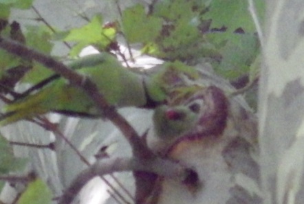 Ce sont des perruches à collier dont une apporte la nourriture au nid.