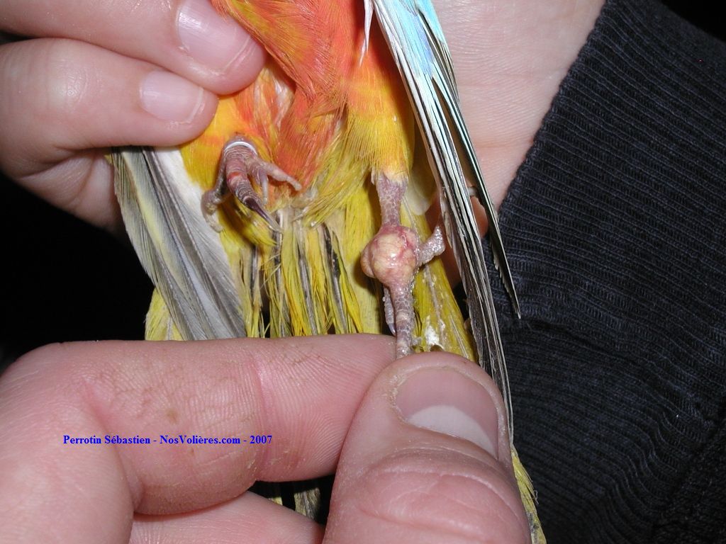 es pattes enflent et ternissent, et l'oiseau souffre beaucoup, au point qu'il a du mal a tenir debout. Elle est très souvent due à  un déséquilibre alimentaire.