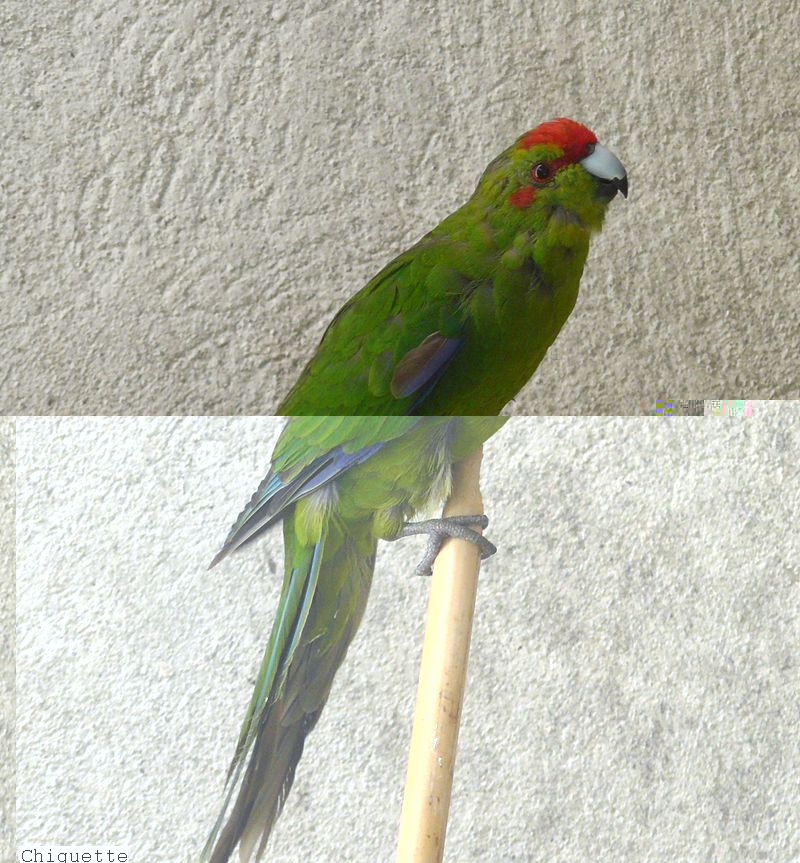 Voici un kakariki vert à  front rouge (ts) et une femelle cinnamon à  front rouge (clair).