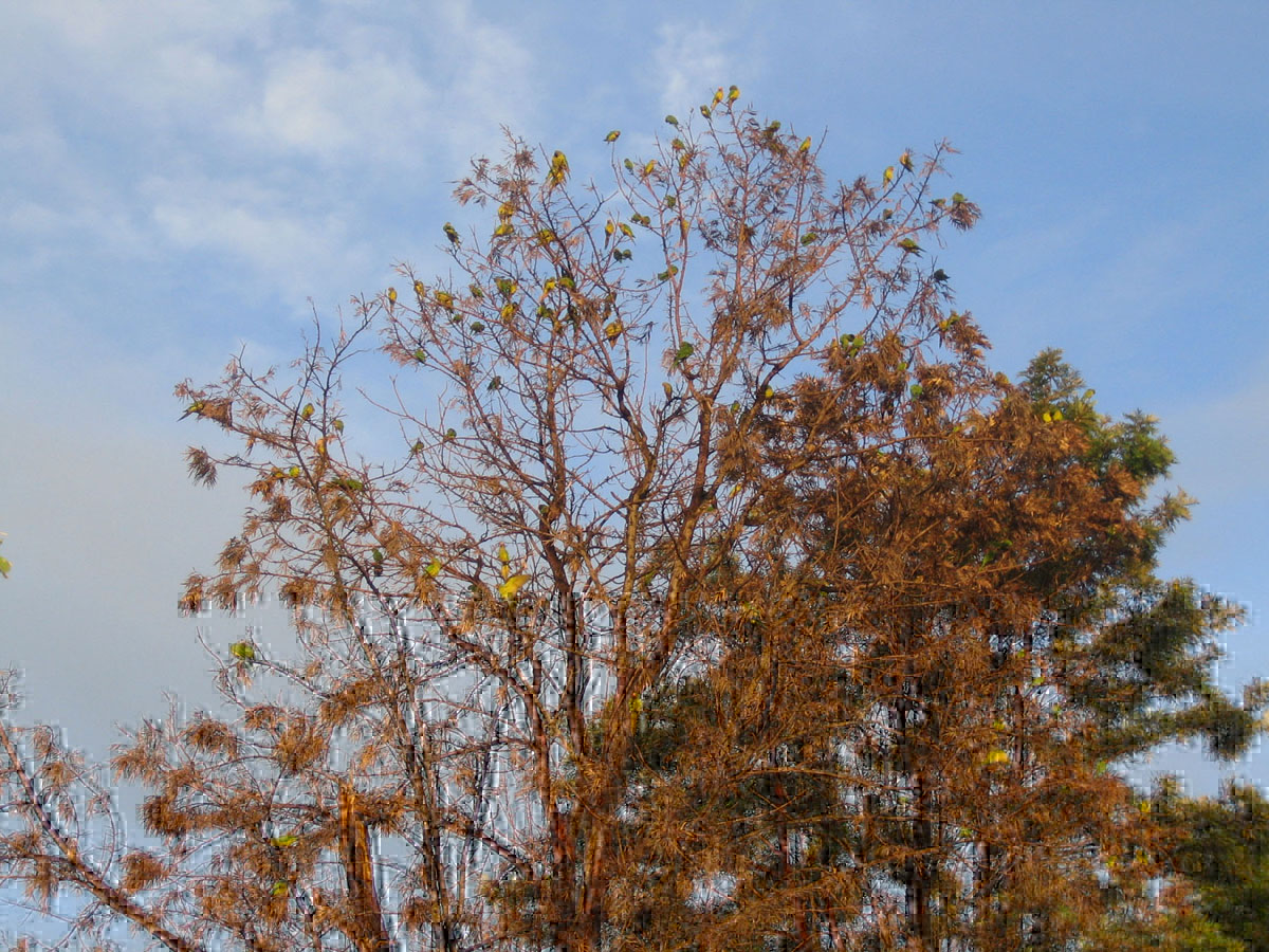 De toute façon, il y a au moins 5 ou 6 types de conures différents sur ce coin-là  suivant la saison (à  tête bleue, etc.). Et voilà  le massacre quand elles se choisissent un dortoir régulier, y’en a des centaines.