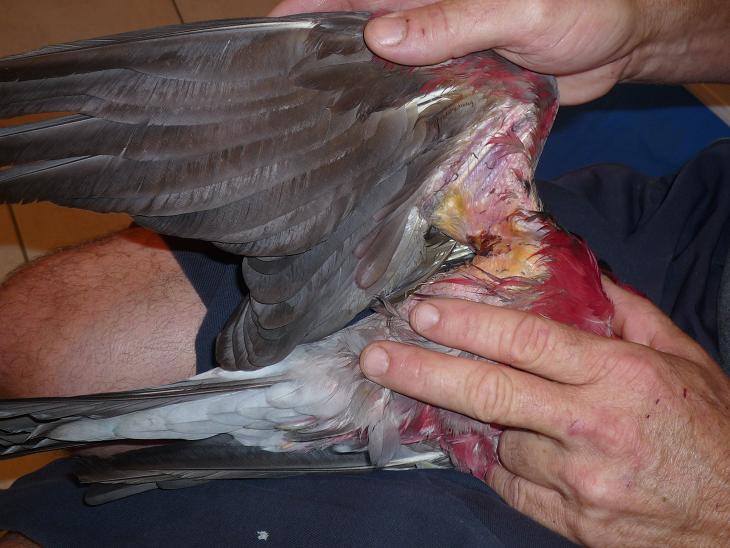 Ils avaient cet oiseau dans une petite cage et il est blessé sous l aile au niveau du pli avec le corp.