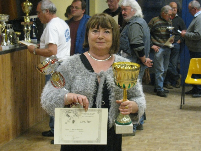 Je reçois la première coupe (cela fait chaud au coeur), celle qui correspond au nombre de titres de champions par éleveur (je suis arrivée en 2ème position, donc 2ème sur 88 éleveurs)