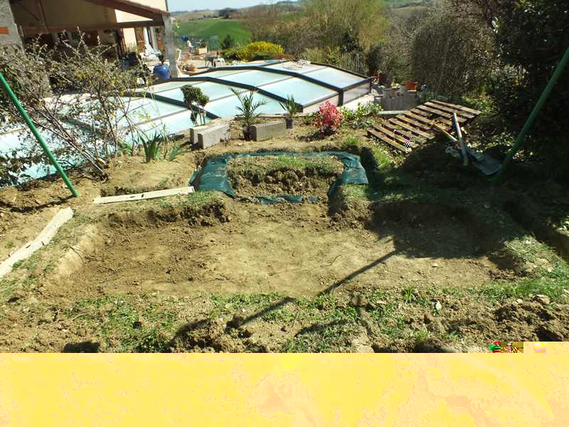 Pour la bache, il faut veiller à  ce quie cela ne ressemble pas à  une piscine enterrée. S'il y a de longues et fortes pluies, cela va devenir un marais et y rester longtemps. Je suppose qu'il est prévue une évacuation , sinon il faut l'envisager.