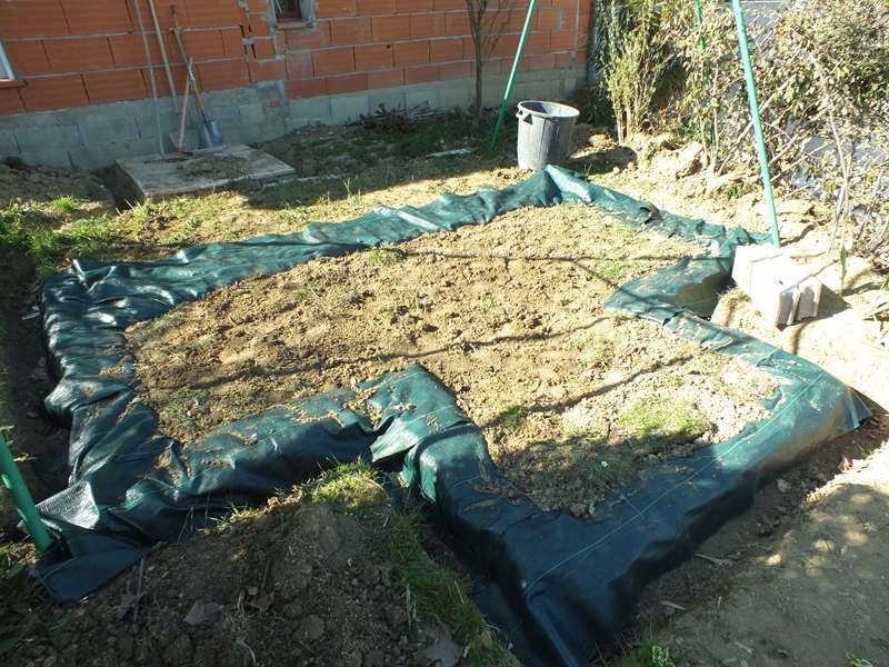 Pour l’instant, les tranchés ont été creusés (voir photo) et je suis en train de protéger le sol avec une bâche qui a la base empêche les mauvaise herbes… Afin de conservé quand même un sol naturel j’ai placé cette bâche à 20 cm de profondeur et recouvert de terre j’espère que ça suffira…