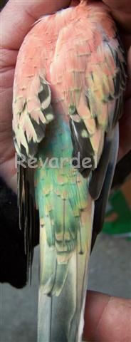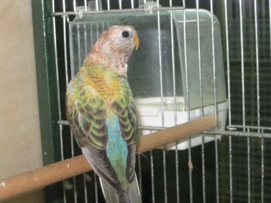 Ci joint un mâle opaline/ino qui était trés vert à la sortie du nid..... aprés la mue, il n'y avait plus que le croupion de bleu!!
