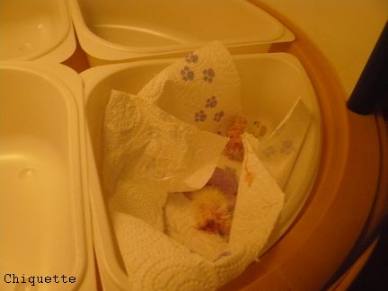 Je comptais en eam mais pas si tôt...Là  j'ai retrouvé un bébé lutino de mort et les deux autres complètement froids, jabot vide, et rouges à  chaque extrémités (aile, bec, pattes).