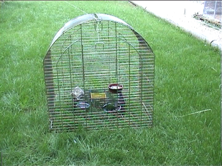 l'appelant est mis dans une petite cage avec nourriture et boisson. Cette petite cage est recouverte par une grande cage avec une porte se fermant de haut en bas. J'attache une fine et longue ficelle sur la poignée de l'ouverture que je commande à  distance.
