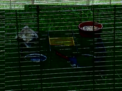 Je pose une pierre sur la petite cage pour la lester et des graines et eau pour le fugueur.