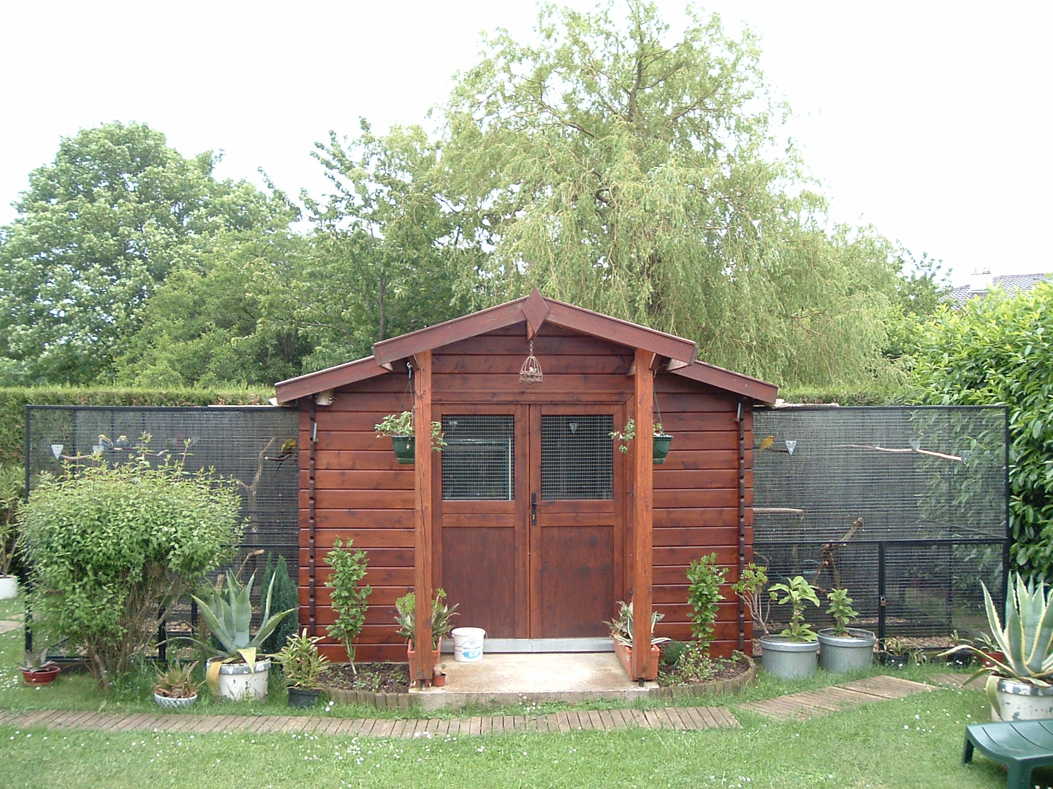 On ne la voit pas bien, mais derrière entre le chalet et les thuyas, il y a une volière de 4m de long par 2 de haut et 1 de large, j'y met tous les jeunes, et ils peuvent aussi rentrer et sortir du chalet comme ils le veulent