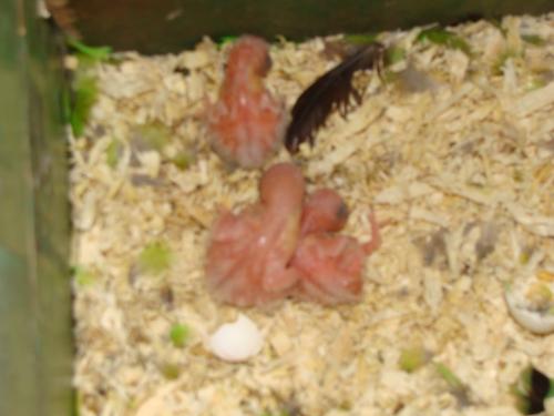 Et vendredi, dimanche et lundi 3 nouveaux bébés sont nés de mon 2ème couple, en espérant que les parents les élèvent bien, pour le moment ils sont bien nourris, la photo est un peu flou, sorry