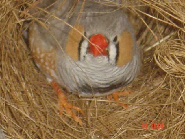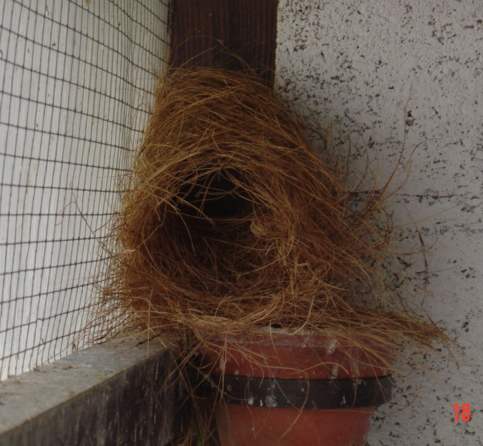 Cet apres midi un mes nombreux couples de mandarins a construit son nid avec de la fibre de coco, je pense qu'il continura demain, c'est le mâle seul qui fait le nid la femelle flane !!!!
